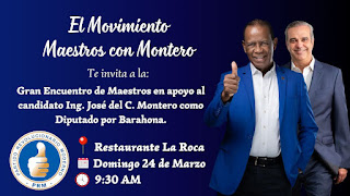 Barahona, Primicias del Sur.- El candidato a diputado por el Partido Revolucionario Moderno (PRM) Jose del Carmen Montero invita a todos los Maestros/as al gran encuentro que va sostener este fin de semana.